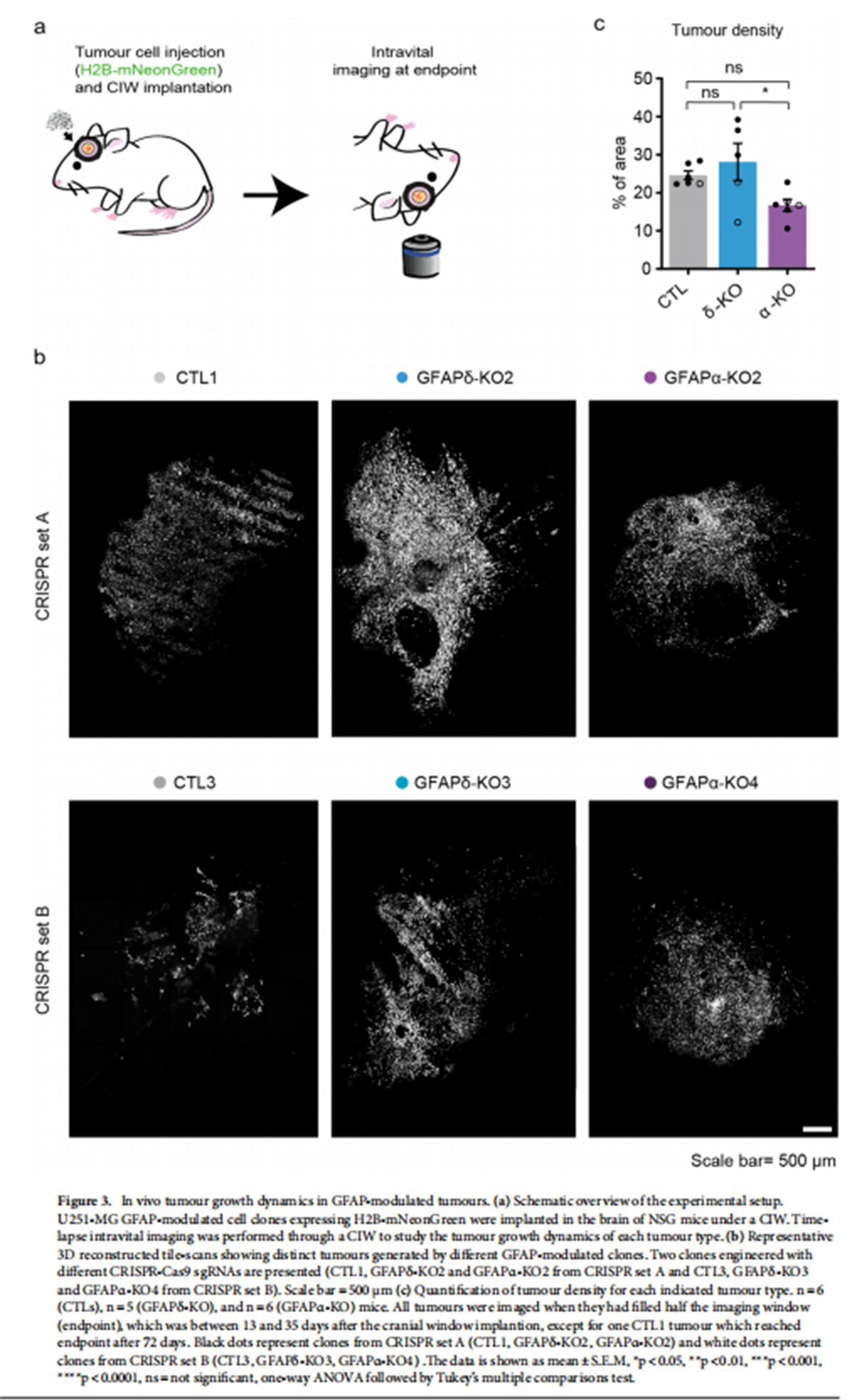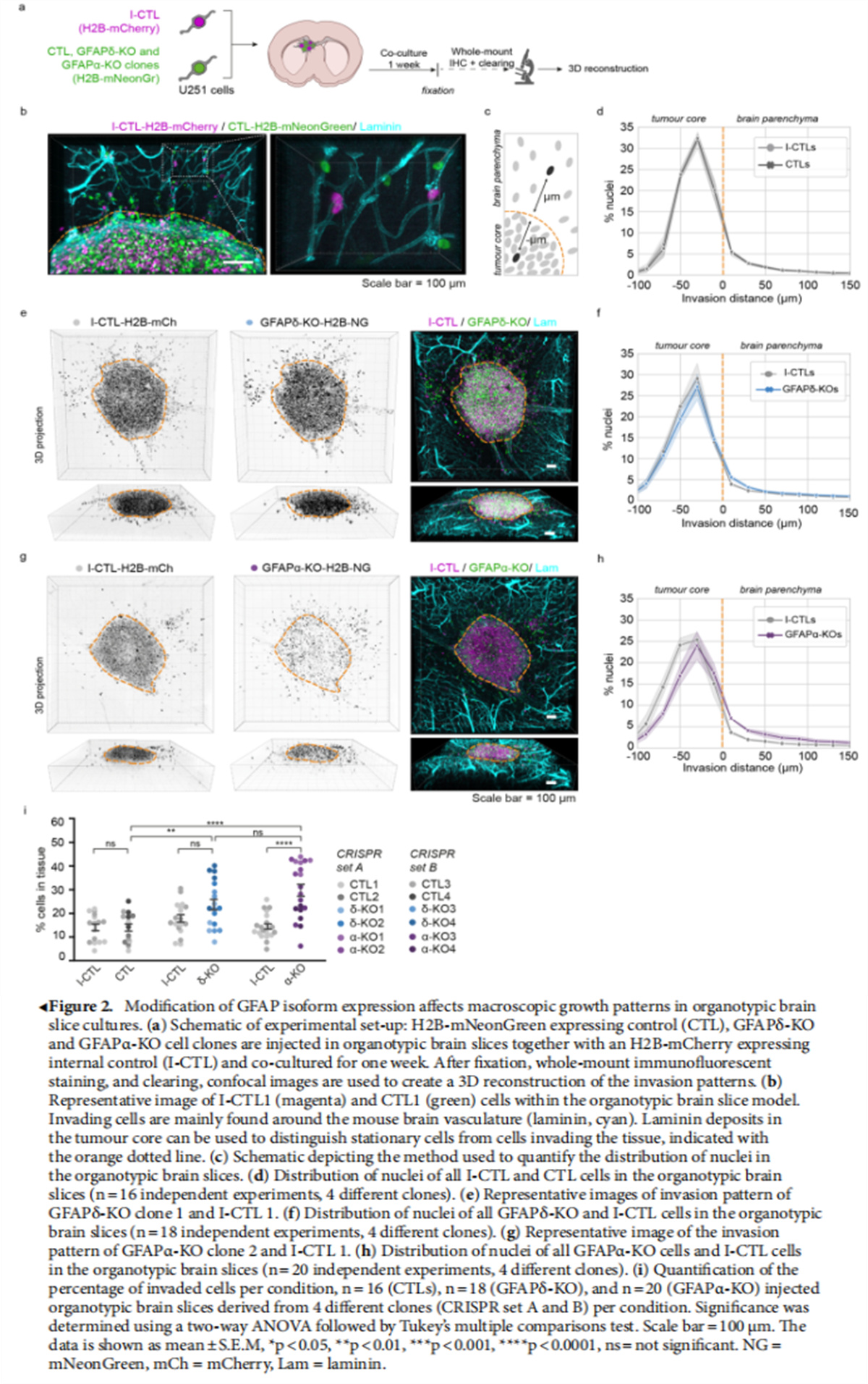 在這項(xiàng)研究中,作者研究了GFAP異構(gòu)體表達(dá)的操縱如何影響人膠質(zhì)瘤細(xì)胞的侵襲和生長(zhǎng)動(dòng)力學(xué)離體和體內(nèi)。我們通過(guò)活體成像縱向監(jiān)測(cè)了總共12個(gè)U251-MG膠質(zhì)瘤細(xì)胞克隆的生長(zhǎng)模式,這些細(xì)胞在離體器官型小鼠腦切片和體內(nèi)小鼠大腦中從GFAPα或GFAPδ同種型中耗盡。作者表明,GFAP網(wǎng)絡(luò)的操作強(qiáng)烈影響神經(jīng)膠質(zhì)瘤細(xì)胞的運(yùn)動(dòng)性和腫瘤生長(zhǎng)模式。GFAPδ-KO細(xì)胞形成更致密的腫瘤,與對(duì)照腫瘤相比具有增加的運(yùn)動(dòng)性并且隨機(jī)遷移,而GFAPα-KO細(xì)胞顯示出更分散的生長(zhǎng)模式并且更持久地向腦實(shí)質(zhì)遷移。